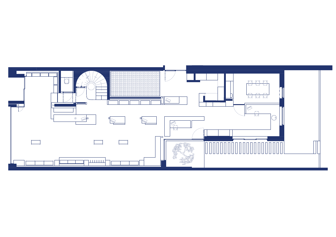 De verhouding tussen privé en professioneel gebruik was doorheen de jaren uit balans geraakt. We kozen voor een maximale herwaardering van bestaande, kwalitatieve structuurelementen door het behoud en de opwaardering van het originele betonskelet in het deel vooraan. Dat werd gezandstraald en in ere hersteld. De achterbouw werd volledig afgebroken en heropgebouwd volgens de hedendaagse energetische normen. Daarbij stonden we als bureau in voor de architectuur -waarbij we samen werkten met een lokale architect- en het volledige interieurontwerp. De split-levels, toegevoegd aan de verdiepingsvloeren, voegen ruimtelijkheid en dynamiek toe.