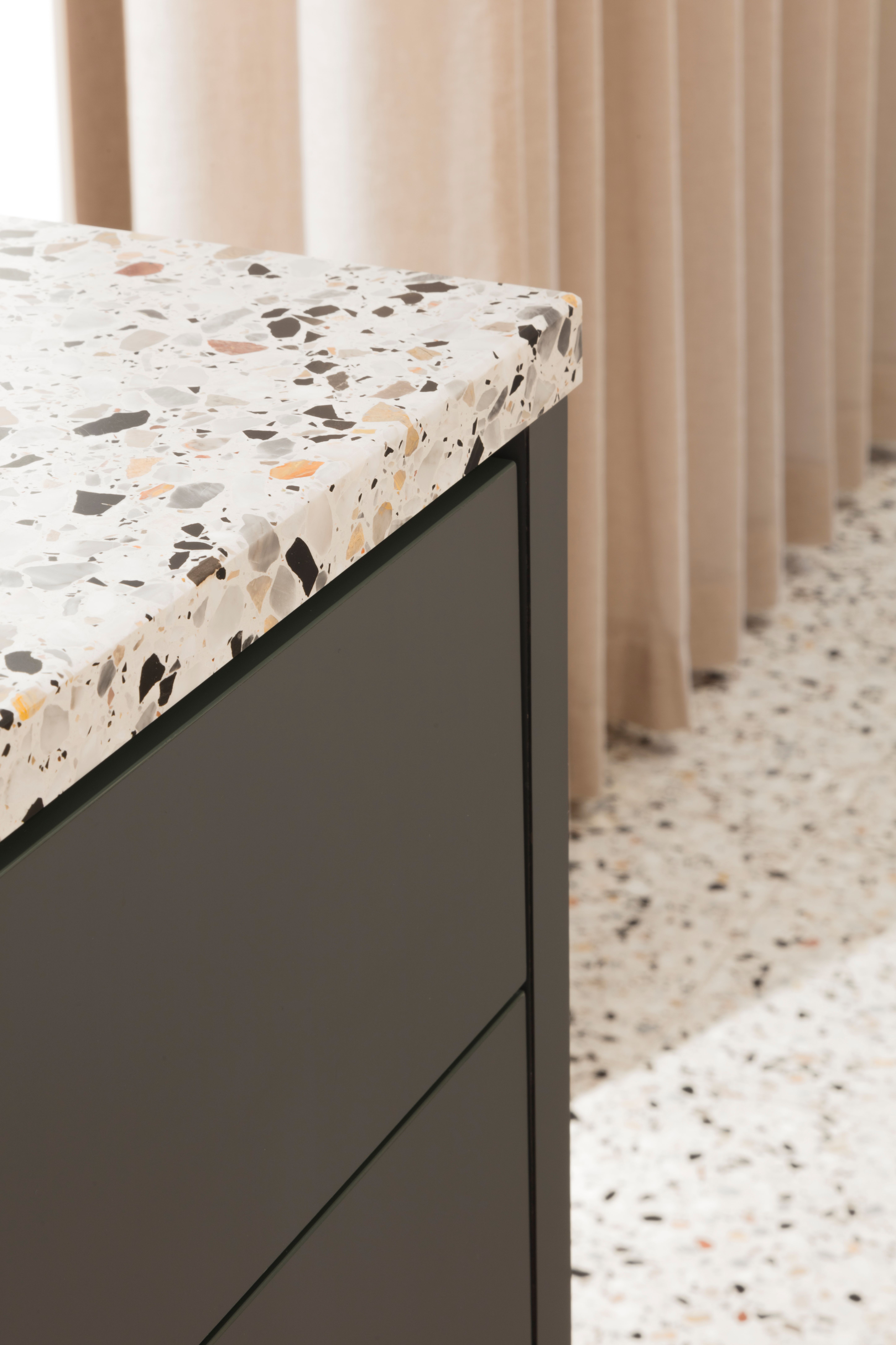 Op de meubels en de vloer is dezelfde terrazzotegel gebruikt. Een fris en weerkerend accent dat van de ruimte een geheel maakt. De gordijnen, in neutrale kleur, brengen rust.