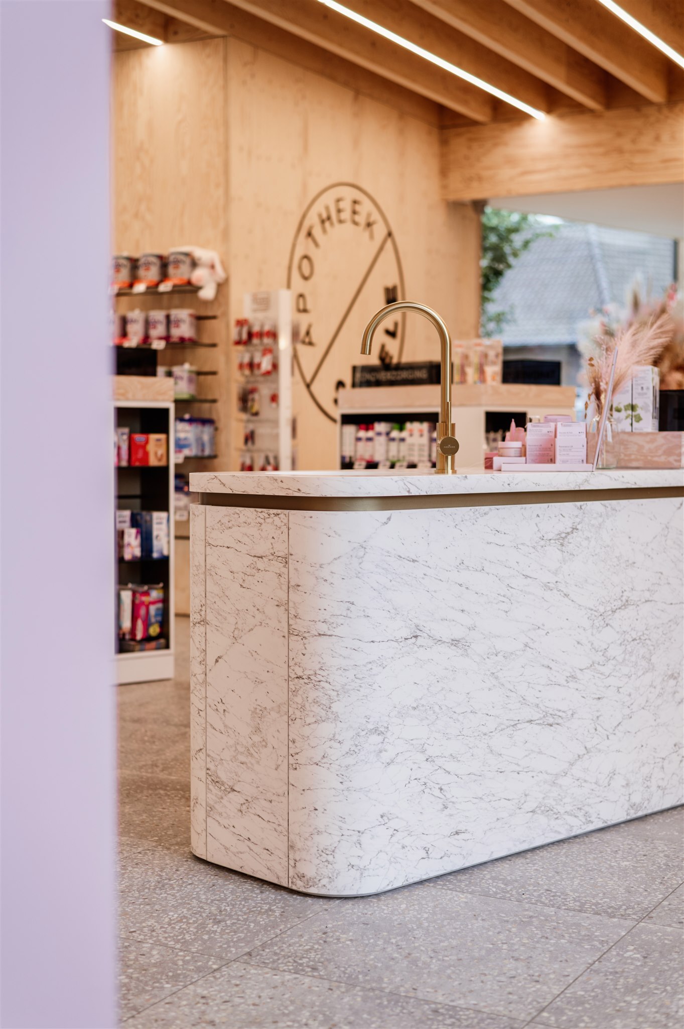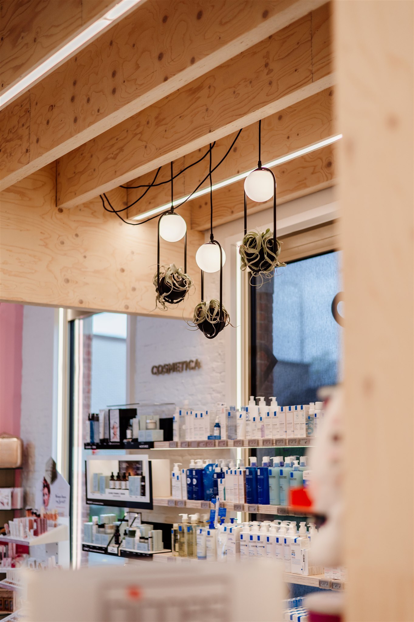 De combinatie van hoogwaardige en natuurlijke materialen - kalkverf, constructiehout en gemarmerd plaatmateriaal- zorgt voor een ingetogen en authentieke uitstraling. Meubelmodules zijn demontabel en herschikbaar, waardoor productpresentaties en zorgzones eenvoudig kunnen worden aangepast.