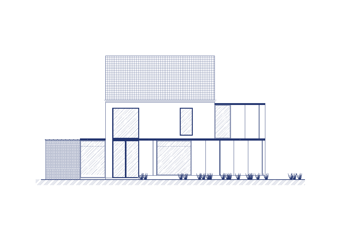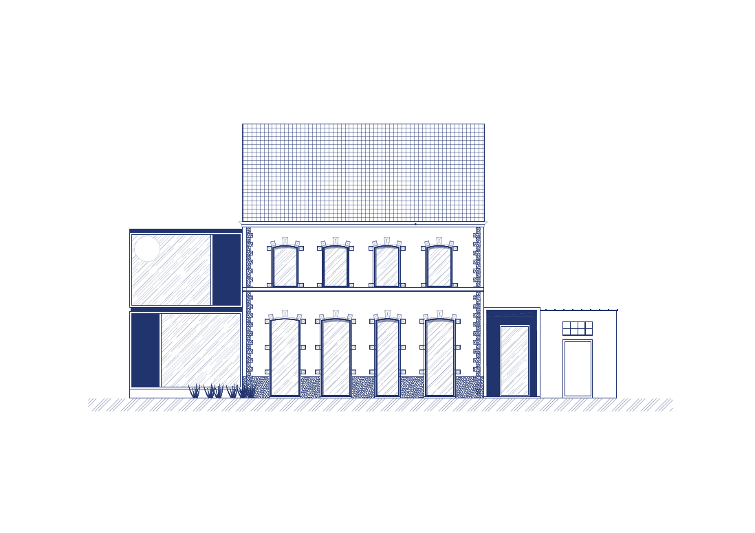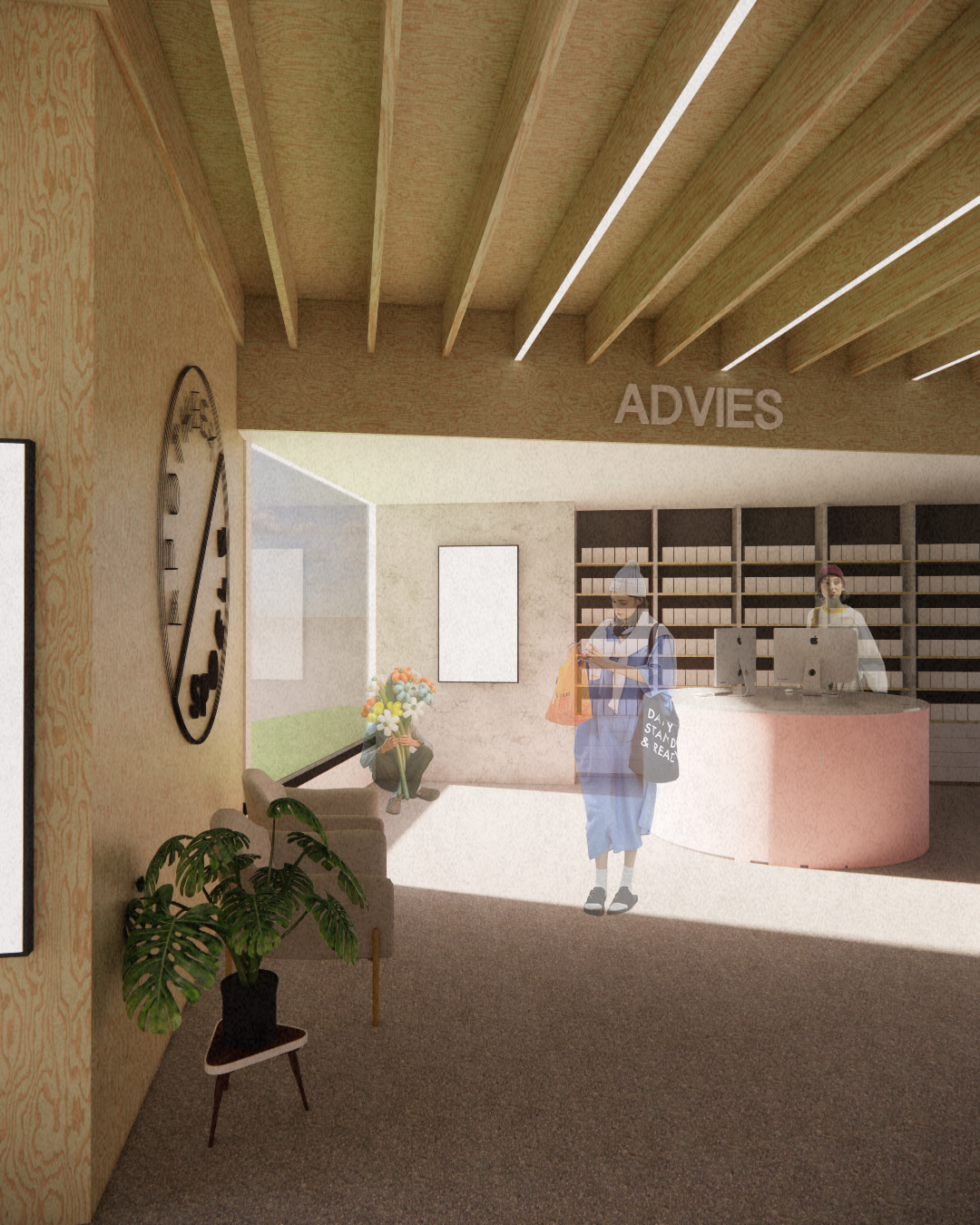 In het hoofdgebouw is een deel van de verdiepingsvloer verwijderd, waardoor een vide ontstaat die de apotheek op het gelijkvloers visueel en functioneel verbindt met de zorgfuncties boven. Met grote glaspartijen valt het daglicht binnen en is er altijd connectie met de straat en de tuin.