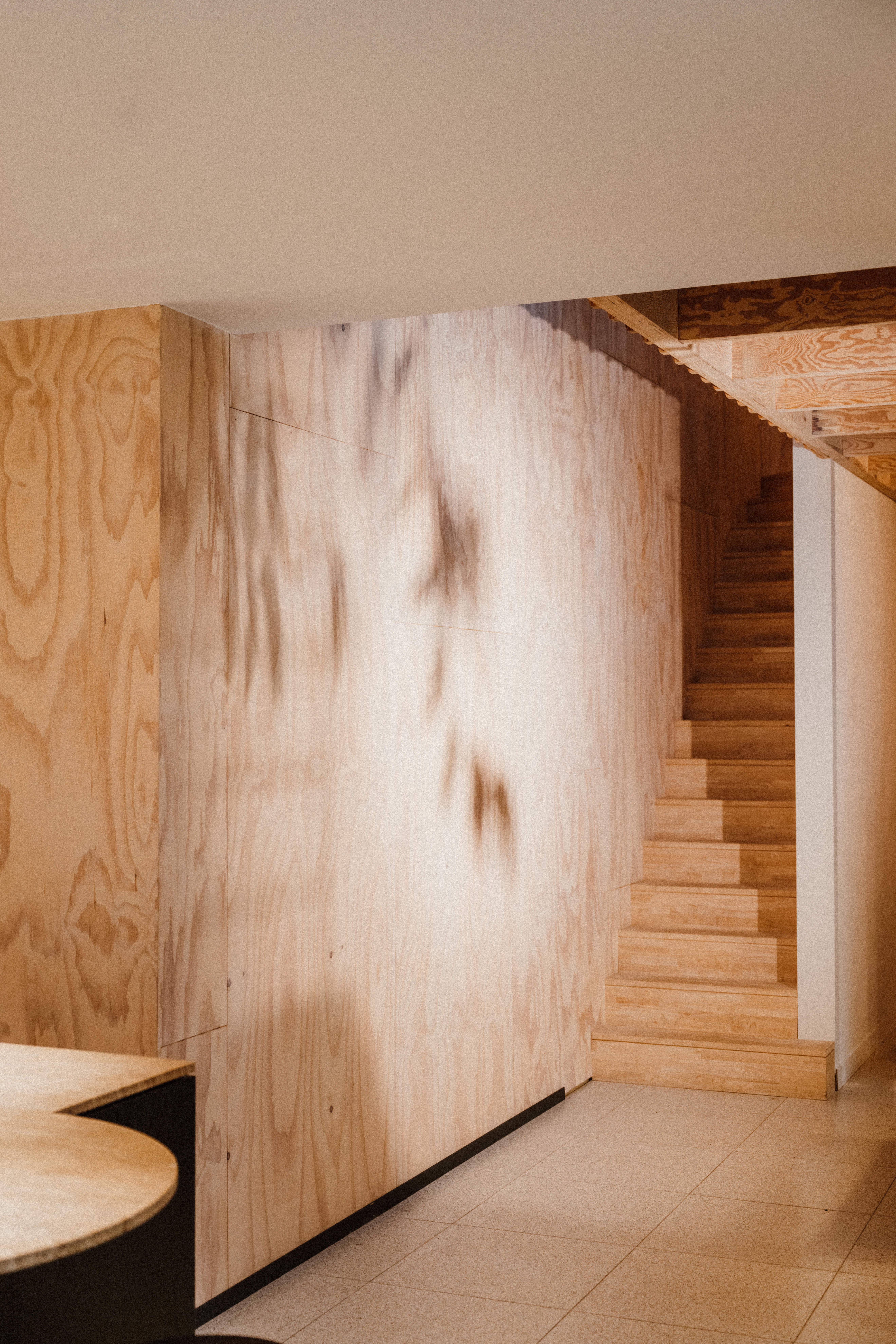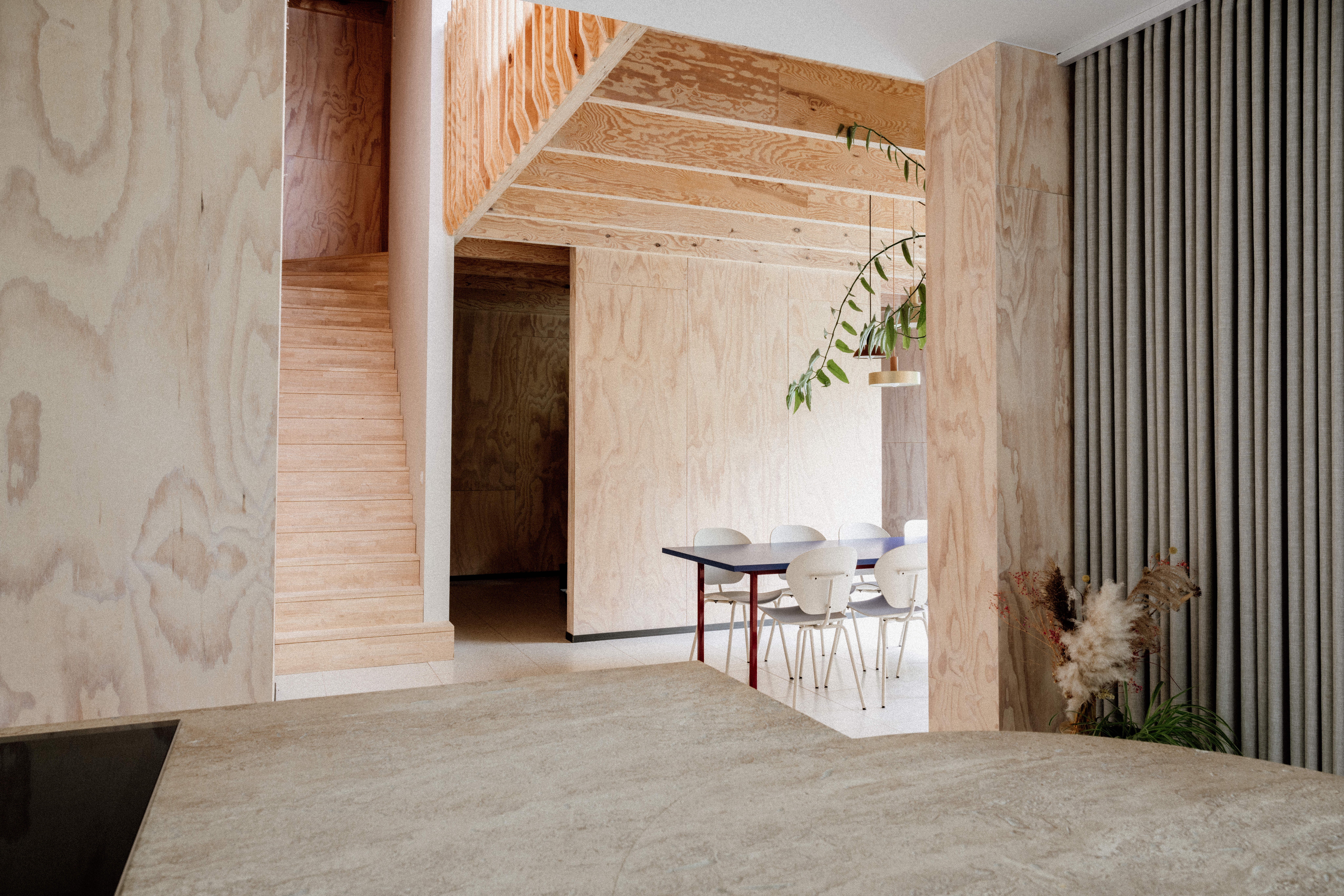 Centraal in deze bungalow staat de trappenhal, gehuld in de warme gloed van Radiata Pine. Dit duurzame hout uit Californië voegt niet alleen een natuurlijke charme toe, maar creëert met zijn speelse karakter een levendige hartslag in het interieur. De houten trap fungeert als een subtiele verbinding naar de eerste verdieping, waar de slaapvertrekken een open blik bieden op de bruisende keuken en leefruimte beneden.