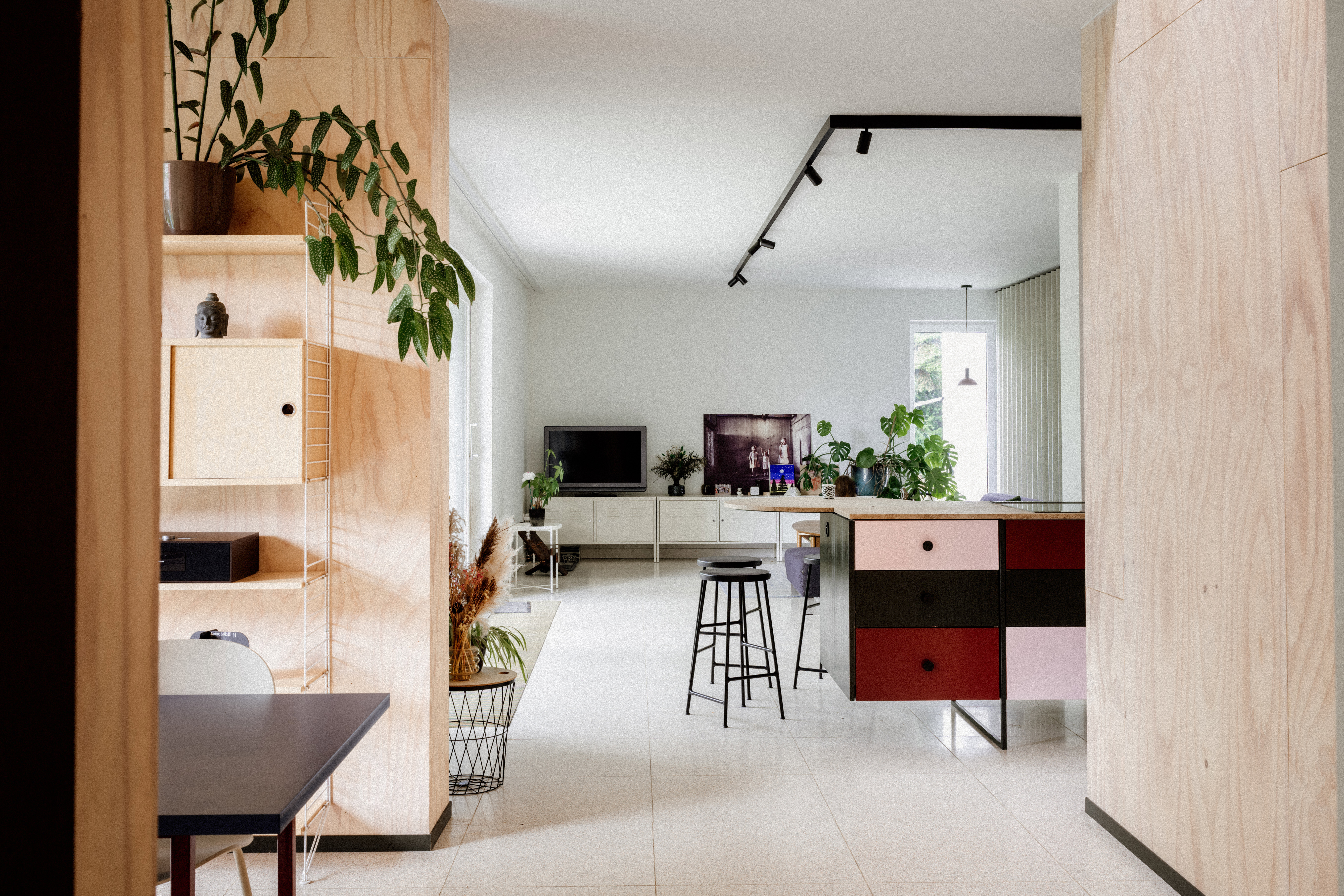 Aan het keukeneiland is een sierlijk afgerond deel voorzien– perfect voor enkele barkrukken. De gekleurde lades en speelse knoppen geven het geheel een uniek en modern design.